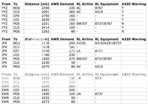 AWS also penalizes A320s on YYZ-CLO, a route with only 100 demand/day. This would also harm smaller airlines in CLO if they wanted to operate longer routes with A320s or 737s.